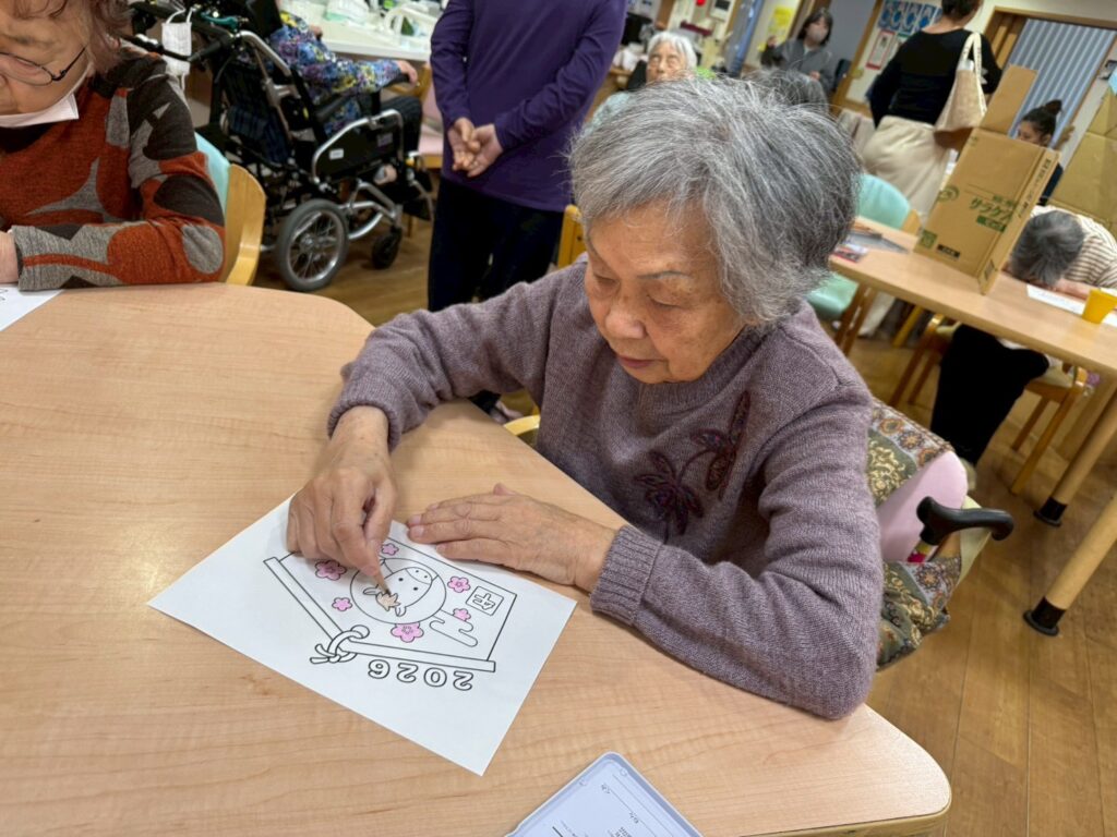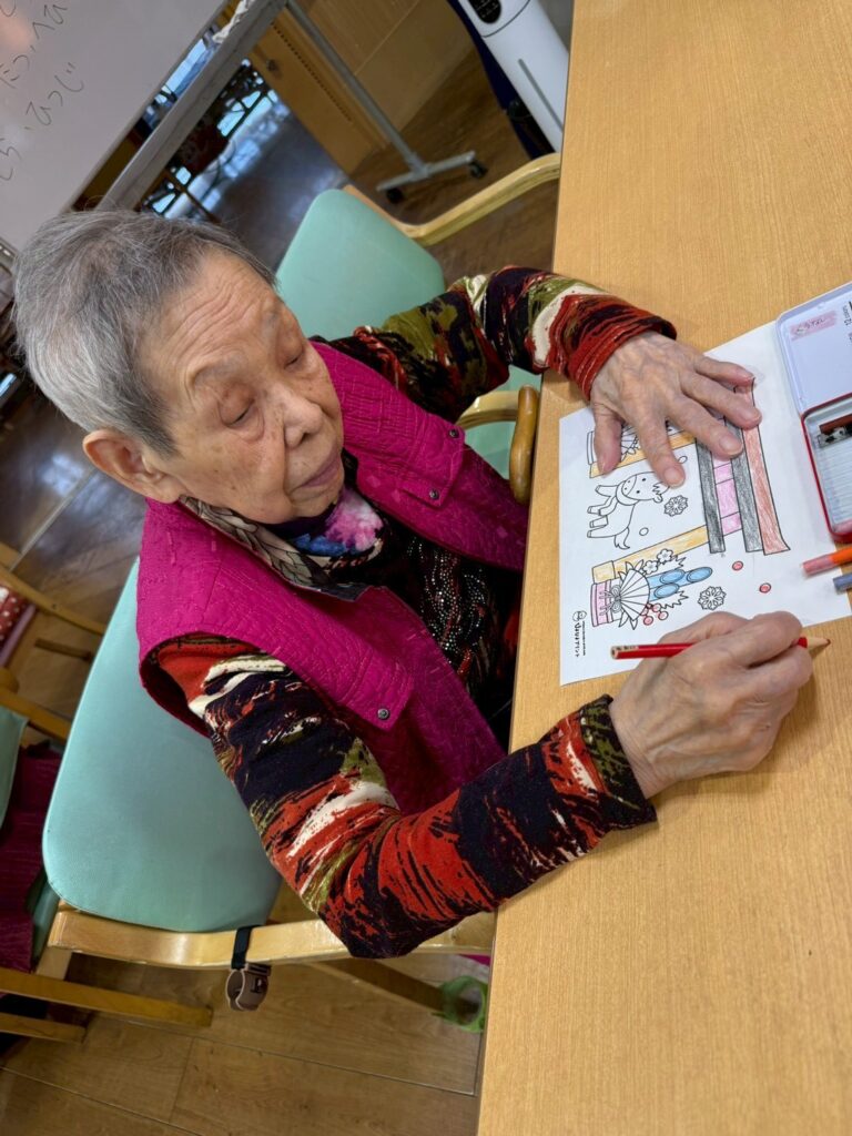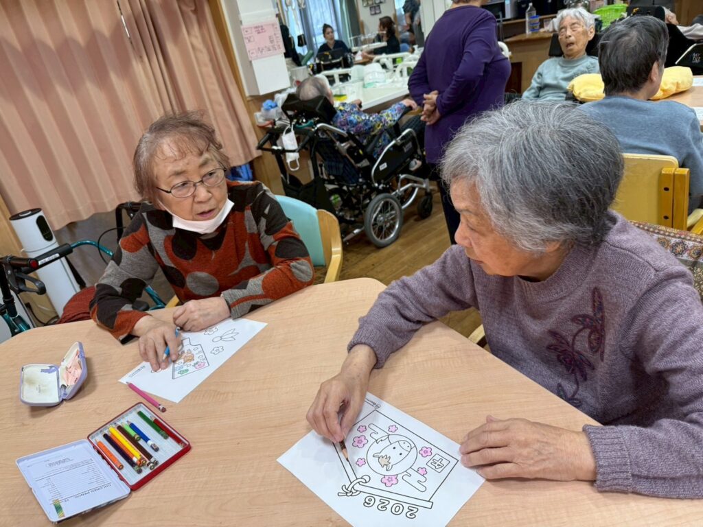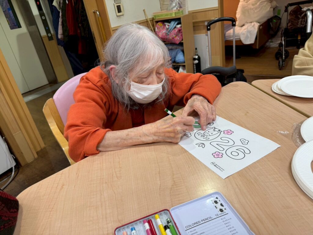 利用者様と一緒に来年の干支の馬の塗り絵を