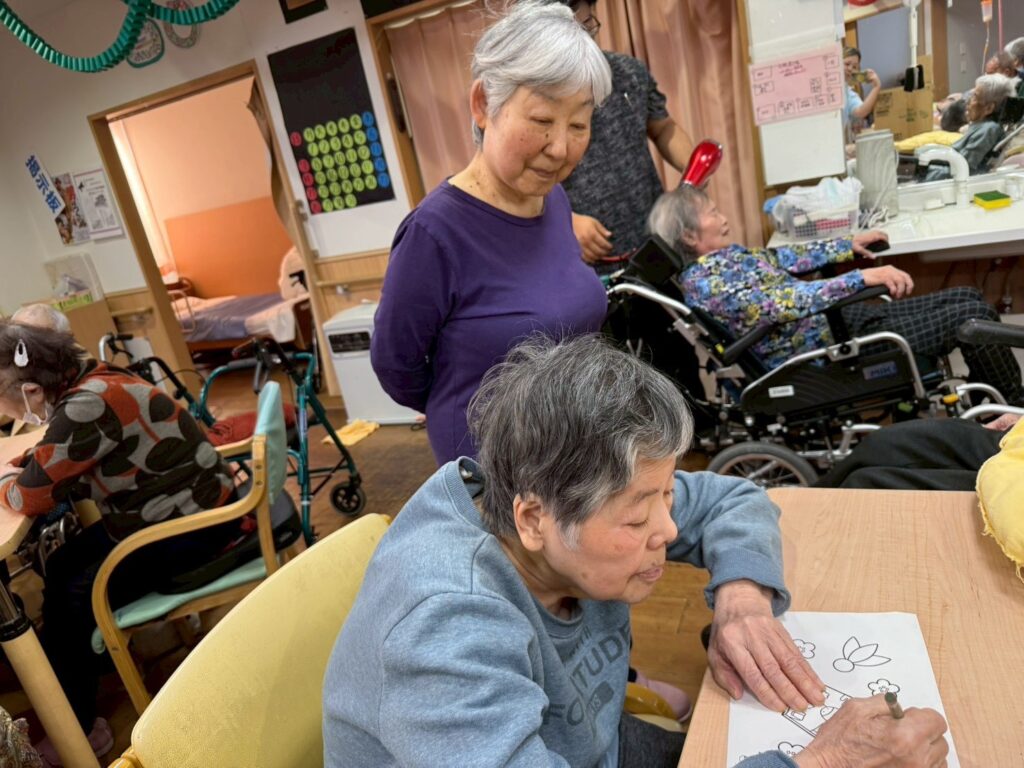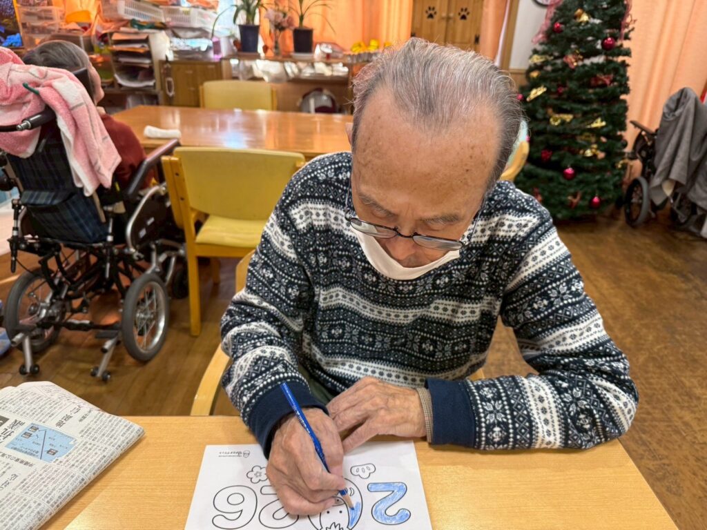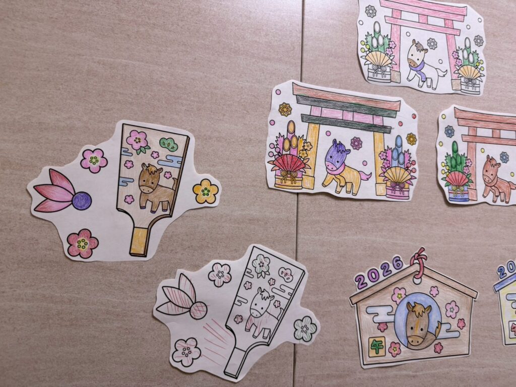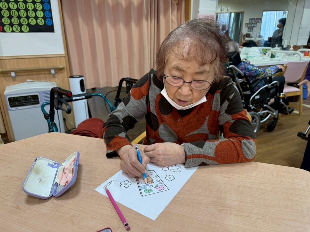 利用者様と一緒に来年の干支の馬の塗り絵を